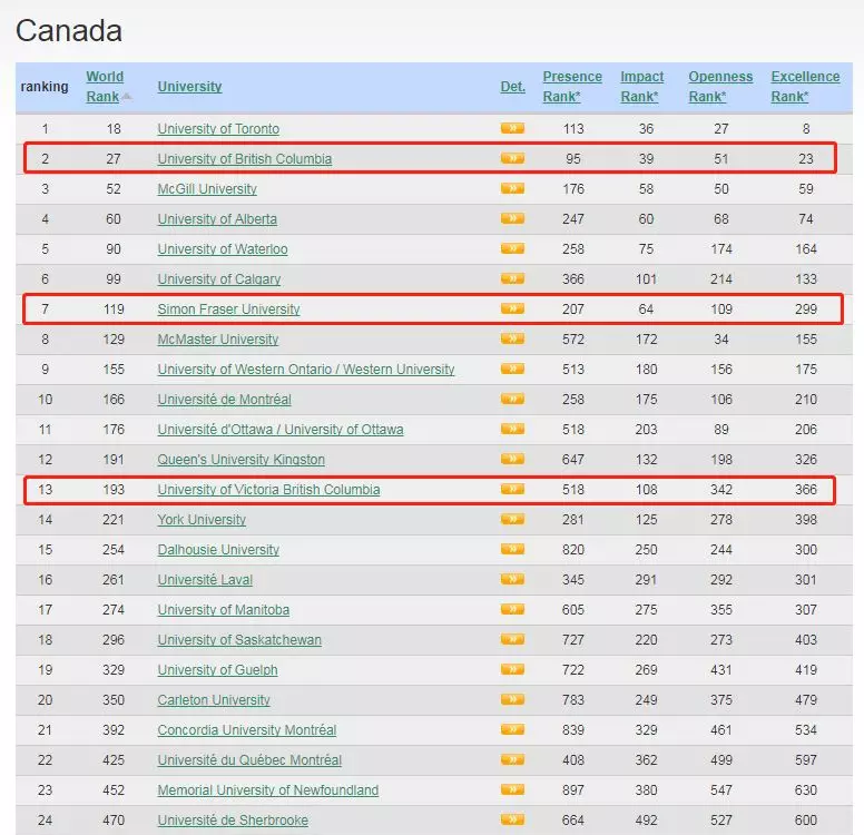 加拿大最权威的大学排名是Macleans Rankings(麦考林杂志大学排行榜),除此之外每年还会有很多机构给你排名,比如QS、THE、ARWU、USNEWS,但是找来找去都找不到College的身影?拜托,加拿大以公立教育为主,College能顶半边天,很多College的名气不亚于University好不好?今天小编就给大家一个带有College的加拿大院校排名,由权威网站RANKING WEB OF UNIVERSITY提供。大温热门的公立学院Douglas College,Langara College,BCIT都在排行榜里。